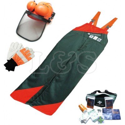 PRODUCT DESCRIPTIONS:Chainsaw Safety Kit - Medium/Standard Leg Kit Includes: - Bib-n-Brace Chainsaw Safety Trousers - Chest: 36-40", Waist: 32-34", Standard Leg - Chainsaw Safety Helmet - Soft Hide Chainsaw Mittens - Bum Bag First Aid Kit Trousers: Protective area A, resistance class 1 (20ms) Complies with: FPA, KWF, DLG Signum Test, CE EN381 Helmet: EN 397:1995, 89/686/EEC Gloves: Class 0 (0-16ms)